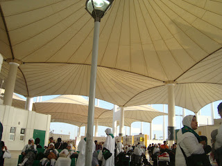 Sesampainya di bandara King Abdul Azziz Jeddah, saya sangat terpukau oleh tutupan (atep) yang kayak payung tenda. Saya pikir, boleh juga nih kalau di Jakarta pasti seru (mau ditaruh dimana tapi..). Lalu sempat ada kejadian menggelikan dimana kita mau naik bus yang akan membaca kita menuju Medina, tapi pintu belum terbuka. Jadilah kita menunggu depan bus satu rombongan. Dan ternyata pintu di kanan sudah terbuka dari tadi. Ya..tidak ingat kalau disana setir kiri….. :”)